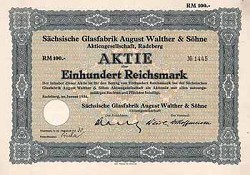 During 1929 - 1932, after the financial crash the Walther family lost its stock majority, through poor management of their company and so August Walther & Söhne A.G. Ottendorf-Okrilla merged with Sächsische Glasfabrik A.G. Radeberg, to form Sächsische Glasfabrik August Walther & Söhne A.G. Sitz Radeberg and production restarted.