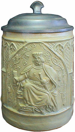 Reproduction by Albert Jacob Thewalt, of a "Pinten" (half a litre) from Frechen bei Köln, Gambrinus and Harvest Thanksgiving in grey stoneware. This example is 84th from a limited run of 5000. The original dates from the second half of the 19th century, however the reproduction has a dated certificate issued on 17/11/72.