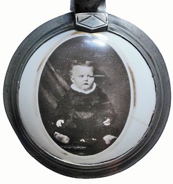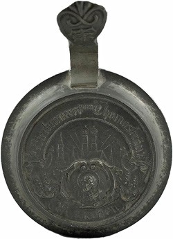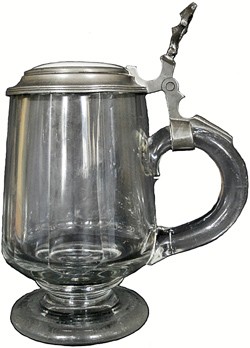 Pewterer's touchmark on underside of pewter lid on glass stein.
