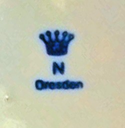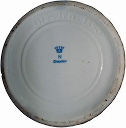 Base of featured stein, right, c/w ink stamp. Also note "Dresden 1880" moulded into base.