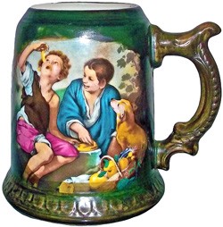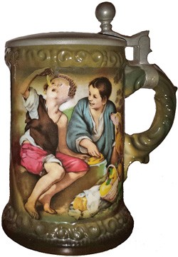 A slightly different body form and handle, but using the same decoration, which originates from a painting by Bartolomé Estebán Murillo