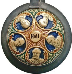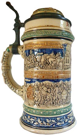 Featured stein (top left). Vendor of anti-Judaic stein.