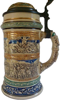 Dümler & Breiden #299. This is one of two anti-Judaic steins designed by Peter Dümler circa 1882. The title of this one is "Freedom". The second design #300 is labelled, "Germania crushes the serpent's head underfoot". This particular example also displays the date 1910, indicating it might have been re-issued. Some examples of the text are as follows: "Deutsches Haus Juden haben keinen Zutritt" (To German houses, Jews have no entry). "Luck and jubilation ring in greater Germany now that the Jews are gone." In one of the scenes, the newly arrived expellees are beginning to dance around and worship a golden calf. In one scene is the message: "Kauft nicht bei Juden" (Don't buy from Jews).
