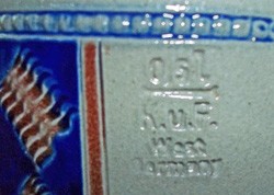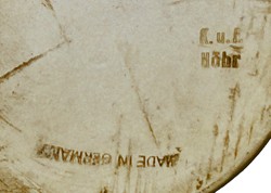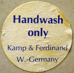 Maker's label on the featured stein above, identifying the K.u.F. name. The hand wash request would indicate that this stein has a transfer over the glaze.