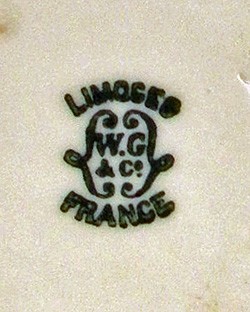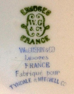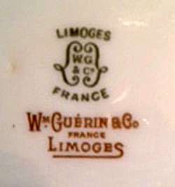 Utzschneider Company of Sarreguemines and run by Leopold Dubois. This enlarged company produced a wide range of wares, selling a lot of whiteware and also continuing decoration. Guérin's sons William and Andre joined the company in 1903. In 1911 W. Guérin & Cie merged with the nearby Pouyat factory, buying 3/4 of Pouyat; the new firm became Guérin & Cie. Possibly both company marks were continued. WWI greatly decreased output. In 1920/21 Bawo & Dotter Ltd., also owner of Elite name, bought Guérin & Cie and became Guérin Pouyat Elite, with Carl Bawo as technical director from 1923. The marks of all 3 firms continued to be used. The factory closed in 1932 and was demolished in 1933.