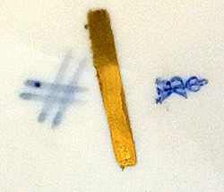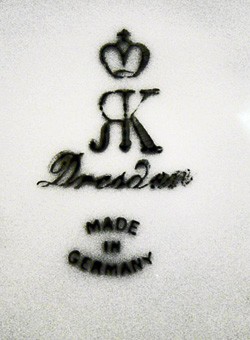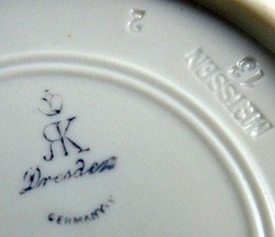 Basemark showing Dresden mark, together with a gold leaf flash attempting to cover the maker's (Schierholz?) identification on the above stein.