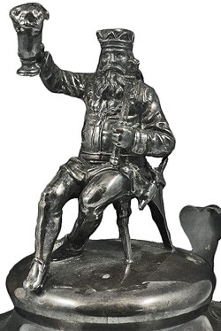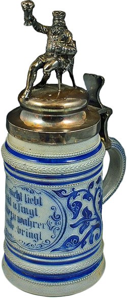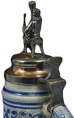 Silver plated "Gambrinus on a chair" lid, on a Simon Peter Gerz I #238B. There is some controversy as to whether this lid is original to this stein, or whether it was originally fitted to a matching silver plated Britannia metal stein. See Steve on Steins.