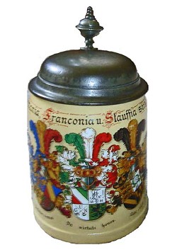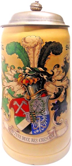 3 Litre Villeroy & Boch - Mettlach #1526 stein, dedicated Xmas 1898 Student association stein. "Saronia sei's Panier". "Virtute Duce Res Crescunt".