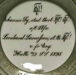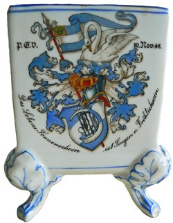 Porcelain vessel, possibly a cigarette dispenser Polytechnischer Gesang Verein (Polytechnic Singing Society) "Des Lebens Sonnenschein ist Singen u. Frohlichsein" Date of formation of the P.G.V. 10th November 1848.