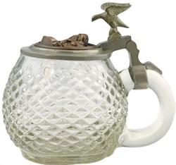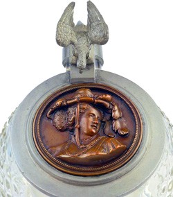 Copper insert on pewter lid with eagle thumbpull, on featured stein.