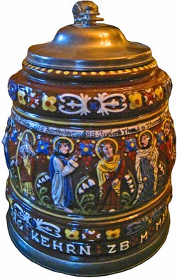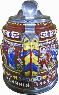 A modern copy of a 2 Litre Creussener Apostelkrug (Apostle stein), the originals of which were made circa 1627-1670. August Saeltzer also made reproductions of these around 1860 to 1880. This reproduction is dated 1972 onward.