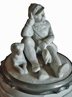 Pewterer's marking on pewter component on underside of figural lid.