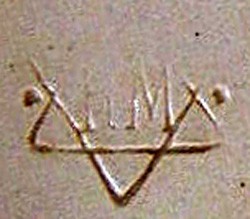 Pewterer's touchmark on the underside of lid of featured stein, above.