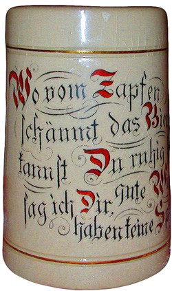 Wo vom Zapfen schäumt das Bier, kannst du ruhig sitzen, sag ich dir, gute Wirthe haben keine Spritzen. "Where from the tap foams the beer, you can sit in peace, so I say, (because) good innkeepers do not splash or spray".