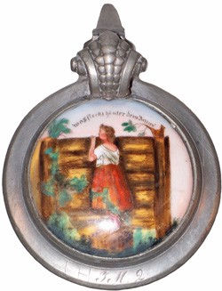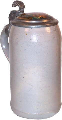Lid on featured stein, with decorated porcelain? insert.