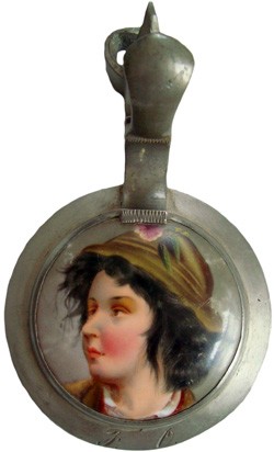 Decorated porcelain insert, inside pewter lid made by J. Brucker
