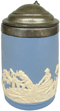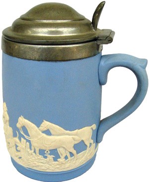 Front view of a stein made in Jasperware, the process of which was originated by Josiah Wedgwood, circa 1775.