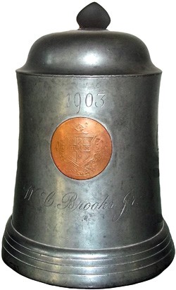 Pewter tankard with copper medallion, base marked #0506, dated 1903.