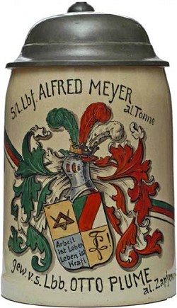 Stein manufactured by Marzi & Remy #1400, before 1918. The dedication is "Leibbursch Otto Plume to Leibfuchs Alfred Meyer". Plume was an Upperclassman / Graduate, Meyer was the initiate.
