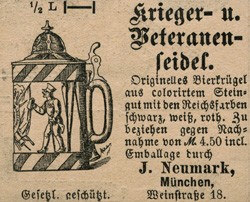 Beiblatt der Fliegenden Blätter, Nr. 2171, Zweites Blatt, LXXXVI. Band (86th volume);München, den 6. March 1887Translation: Soldiers and Veterans stein. Original beer stein in coloured earthenware, with the national colours of (the German flag) black, white and red.Available with cash on delivery of 4.5 Marks, includes packing from J. Neumark, Weinstraße 18, Munich. Legally Protected.
