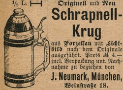 Beiblatt der Fliegenden Blätter, Nr. 2345, Drittes Blatt, 93. Band (93th volume) München, den 6. July 1890 Translation: 1/2 L. Genuine and Latest Shrapnel Stein in porcelain with lithophane, replicated from the original. Price 4 Marks, includes packing available with cash on delivery from J. Neumark, Weinstraße 18, Munich.