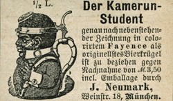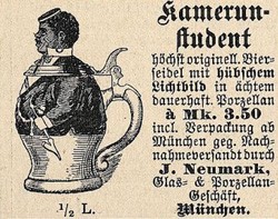 Beiblatt der Fliegenden Blätter, Nr. 2189, Zweites Blatt, LXXXVII. Band (87th volume); München, den 10. July 1887 Translation: The Cameroon Student 1/2L.Exactly as in the accompanying advertisement in coloured faience as an original beer stein, available with cash on delivery for 3.50 Marks, includes packaging from J. Neumark, Weinstraße 18, Munich.