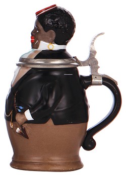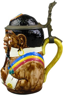 Der Kamerun-Student / "The Cameroon Student" stein, mould #1005, ECS187. Manufactured by Gebrüder Horn, in faience, the Cameroon Student originates from one of the then new German colonies in Africa, in this case in West Africa. The German Cameroons existed between 1884 to 1916. The student is depicted as belonging to a dueling fraternity, by evidence of the white scars.
