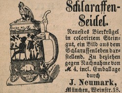 Beiblatt der Fliegenden Blätter, Nr. 2183, Zweites Blatt, LXXXVI. Band (86th volume); München, den 29. May 1887 Translation: Utopia Stein Newest beer stein in colored earthenware, produced (with) a picture of the Utopian life. Available with cash on delivery 4 Marks. includes packing from J. Neumark, Weinstraße 18, Munich.