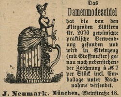 Beiblatt der Fliegenden Blätter, Nr. 2212, Viertes Blatt, LXXXVII. Band (87th volume); München, den 18. December 1887Translation: The Fashionable Lady Steinwas found in the catalog as #2070 as desirable, useful and available with stoneware body designexactly like the accompanying advertisement at 7 Marks per piece, includes packing and cash on delivery to be sent.J. Neumark, Weinstraße 18, Munich,