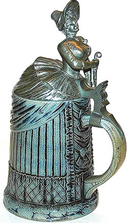 The Fashionable Lady stein, otherwise known as the "Lady with Bustle" by Hauber & Reuther. The advertised model, ECS245, (top) has a fluted pewter lid to represent the top half of the bustle,