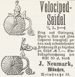 Beiblatt der Fliegenden Blätter, Nr. 2139, Zweites Blatt, LXXXV. Band (85th volume)München, den 25. July 1886Velocipede - Stein 1/2 litre stein (made) out of stoneware, figure and (rear) wheel (made) out of tin (pewter) (the latter movable) exactly like the adjacent advertisement (and) available price each 7 marks. Packing price 50 Pfennig per box through J. Neumark, Munich, Weinstraße 18.