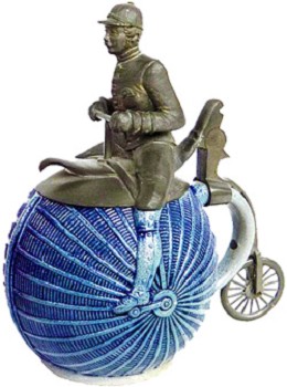 Penny-Farthing / High Wheeler bicycle - ECS460. 1/2 litre Cobalt blue, salt glaze stoneware sphere making up the drinking portion, with pewter components making up the lid / hinge, rider and rear wheel assembly.