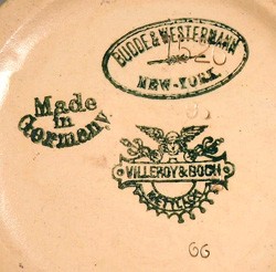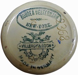 Budde & Westermann inkstamp, together with, Villeroy & Boch - Mettlach mercury mark for 1895, with impressed mark showing 1895 or 96, all on the above stein This was probably imported as a blank and decorated in the U.S. in 1900, to customer order.