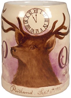Villeroy & Boch - Mettlach #1526 1/2 litre stein, decorated for the Benevolent and Protective Order of Elks. Marked B.P.O.E. Portland, Sept. 6th 1900. No.142. The clock is set to denote the 11.00pm toast.