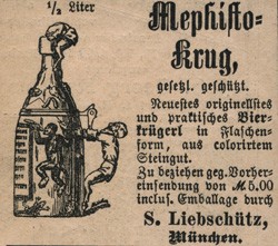 Beiblatt der Fliegenden Blätter, Nr. 2167, Erstes Blatt, LXXXVI. Band (86th volume);München, den 6. February 18871/2 litre Mephistopheles (the Devil) character stein by Hauber & Reuther, (as below), dated 1882-1887. Translation: Legally Protected = patented, copyrightedNewest, most original and practical beer stein in bottle form, (made) out of earthenware.(In order) to obtain (one) pay in advance 5 Marks (which) includes packing from S. Liebschütz, Munich.