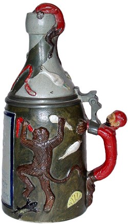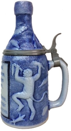 1/2 litre blue - grey glazed bottle stein by Hauber & Reuther #183. Known as ECS464. It has the same body but different lid and handle to the Mephistopheles (Devil) character stein seen left. Supplied and marked L. Bauernfreund & Cie.