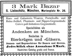 Advertisement from the catalogue of Munich's 3rd International Art Exposition, dated June 1888. Translation: Short fancy goods, Wallets and travel articles, Fantasy and knick-knack items. Imitation leather items. Souvenirs of Munich, Beer mugs and glasses, Parasols and umbrellas for men and women. Each piece without exception 3 marks. Free illustrated catalogue, and postage paid.