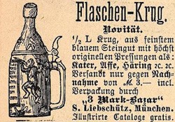 Flaschen-Krug Beiblatt der Fliegenden Blätter, Nr. 2223, Zweites Blatt, LXXXVIII. Band (88th volume) München, den 4. March 1888 Bottle - Stein. Novelty. 1/2 liter stein (made) of the finest blue pottery with the best original moulded (figures of): tom-cat, monkey, herring, etc. (drinking symbols). Sent only with cash on delivery of 3 Marks, includes packaging. "3 Mark-Bazar" S. Liebschütz, Munich. Free Illustrated Catalogue.