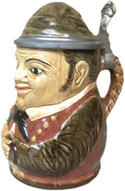 "Der Deutsche Michel", mould #1045. Dated circa 1887, manufactured by Gebrüder Horn. This stein has also been assigned the ECS225 number, which is shared with the "Monk" stein which uses Mould #138. To differentiate, "Der Deutsche Michel" is ECS225R.
