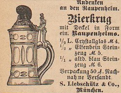 Beiblatt der Fliegenden Blätter, Nr. 2295, Drittes Blatt, XCI. Band (=91st volume) München, den 21. July 1889 Souvenir of the Raupenhelm (Dragoon's Crested Helmet) Beer Stein with lid in the form of a Raupenhelm 1/2 litre Crystal Glass 4 marks 1/2 litre Ivory Stoneware 5 marks 1 litre Old German Blue Stoneware 6 marks Packing 50 Pfennig cash on delivery S. Liebschütz & Co., Munich.