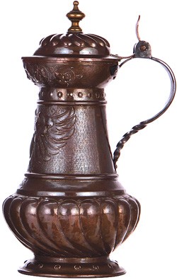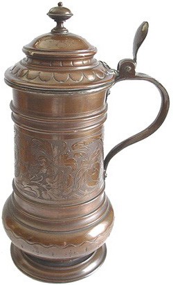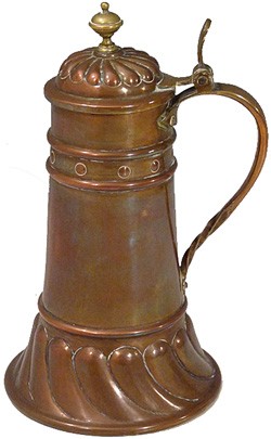 Copper, hinge lidded, tankard, 10" tall. Note twisted handle.