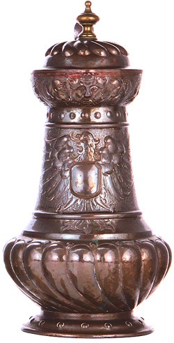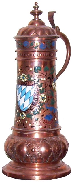 Bavarian Shield and floral design on copper, hinge lidded, tankard. All the examples on this page are attributed to F.X. Kusterer, but are as yet to be confirmed.