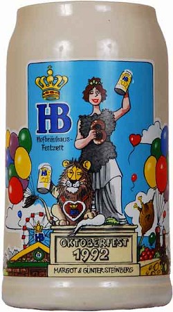 1992 HB Festzelt 1 Ltr. tankard, depicting "Bavaria" Design is by Dieter Hanitzsch.