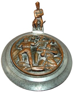 Pewter lid with copper insert on featured stein, showing a mining scene. Freiberg Mining Academy, was established as the world's first school of mines in 1765. This lid is almost certainly the work of Gustavus Adolphus Vaeterlein, whose workshops were only 120 metres away from Paessler's shop.