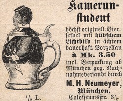 Another version of the Kamerun Student Highly Original. Beer stein with prettylithophane of farm scene. Porcelain at 3.5 Marks, including packaging. Sent C.O.D from Munich.