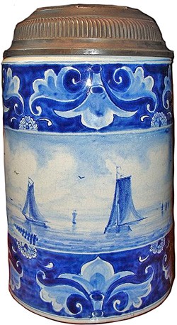 Tin glazed earthenware stein finished in Delft Blue.