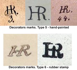 The A.J.Thewalt factory sold undecorated, or partially decorated steins to HR who then completed them and marked them with a type 5 mark and later the type 6 rubber stamp marks (below), These steins also carried the Thewalt factory mark. All Thewalt activity was post 1897. The rubber stamps are also found on HR produced porcelain steins.  It is believed the rubber stamp was used after HR was no longer producing steins and were working off their inventory. Here we see A.J.Thewalt 3Ltr. #92, subsequently decorated by HR and type 6 stamp added.
