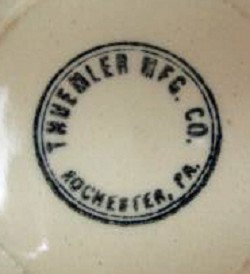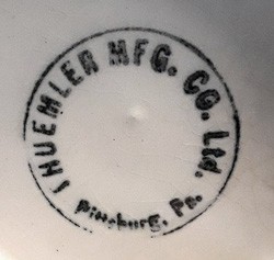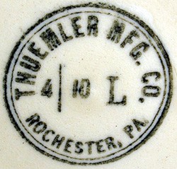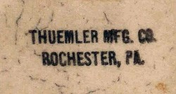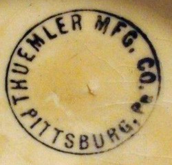 Hugo Thuemler was born in Germany in 1847. By 1894, he was living in Rochester, near Pittsburgh, Pennsylvania. In 1898 he was recorded as running a novelty, china & glass decoration company in Rochester. By 1901 he had relocated his studio to Sewickley, again near Pittsburgh, together with a sales outlet at 1507 Liberty Avenue, Pittsburgh. The majority of his business was supply of custom transfer decorated brewery steins and mugs to the breweries who used them liberally for publicity purposes. He did however supply other items, such as root beer mugs, whiskey jugs and many commemorative pieces, again all transfer decorated. Some of these were purchased from Knowles Taylor & Knowles (KT&K) of East Liverpool. He supplied