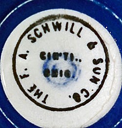 Ink stamp on promotional stein giveaway made for F. A. Schwill & Son Co. Grain Suppliers, who were listed in 1889 as being at 104 Main Street, Cincinnati. Ohio.