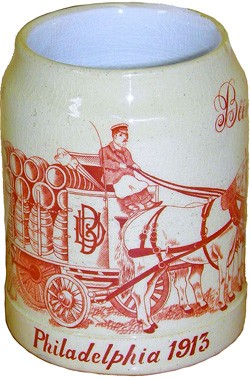 Ink stamp of Thuemler on a 10 ounce stein with, what looks to me like, H.W.Spitz of Philadelphia, on a stein with the transfer decoration, advertising Weger Brothers Export Dark Beer.